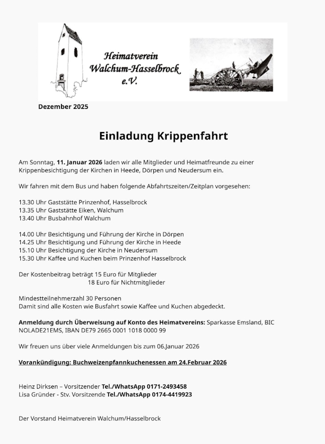 Einladung zur Krippenfahrt am 11.01.2026 Dezember 23, 2025 (WS – 24.12.2025) Der Heimatverein lädt ein zur Krippenfahrt, siehe Flyer!