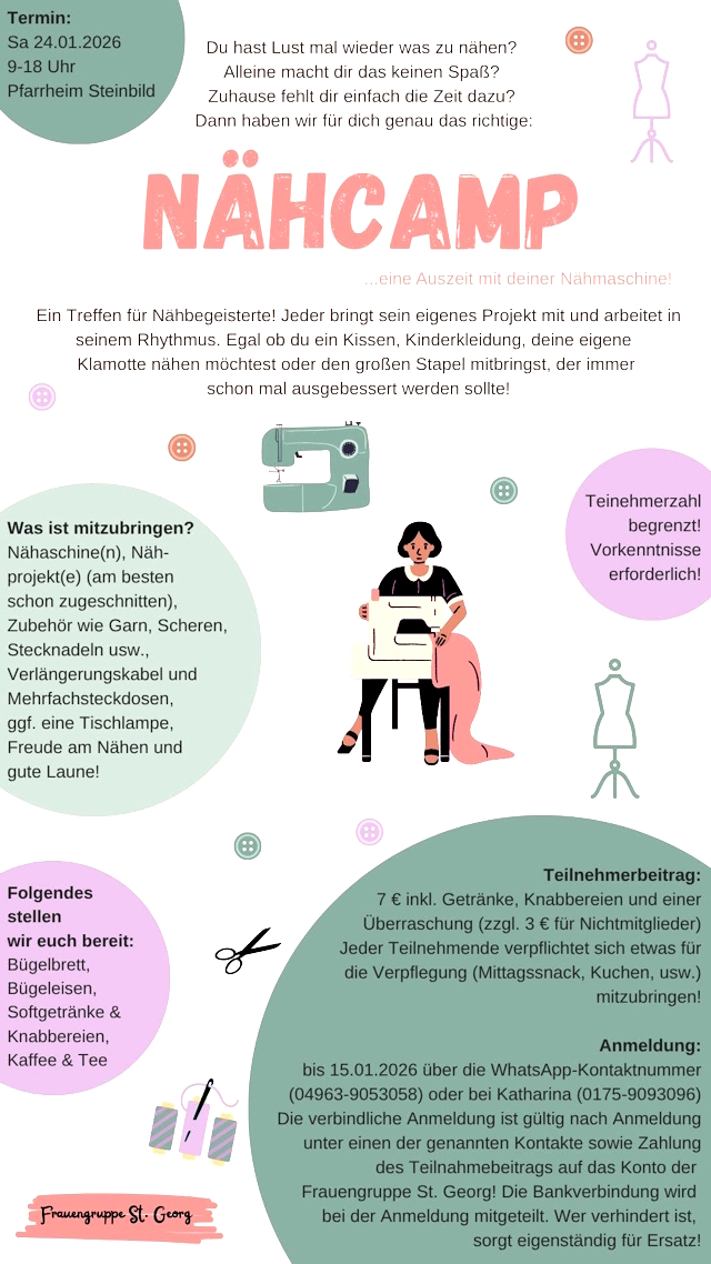 Das Jahr ist noch nicht zu Ende, aber wir wollen jetzt schon auf eine Veranstaltung im Januar hinweisen: Wir veranstalten am Sa 24.01.2026 ein “Nähcamp – eine Auszeit mit deiner Nähmaschine”!