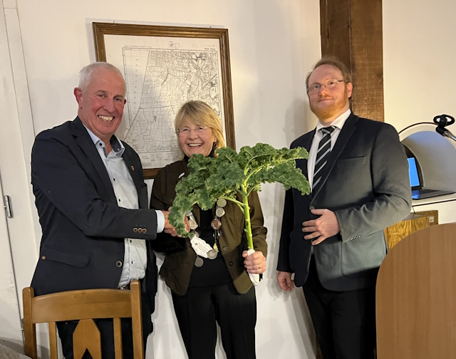 Bürgermeister Alois Milsch (links) und der vorjährige Grünkohlkönig Thomas Kassens beglückwünschen die neue Grünkohlkönigin Gudrun Jenke zu ihrem neuen Amt.
