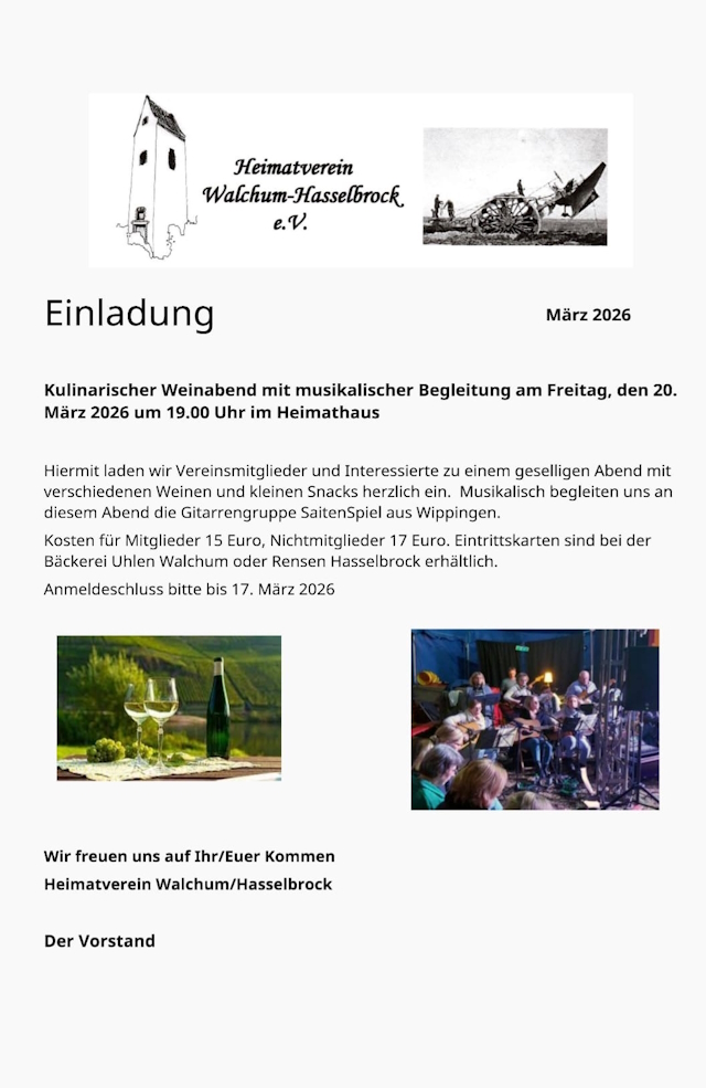 • Heimatverein: Einladung zum Weinabend am 20. März.