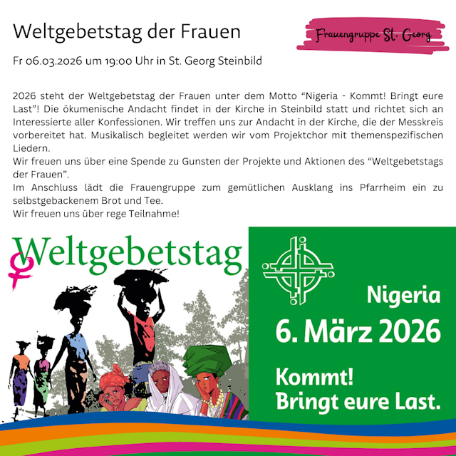Frauengruppe St. Georg: Weltgebetstag der Frauen am 6. März. Februar 27, 2026 (WS – 27.02.2026) Siehe Flyer!