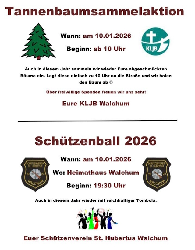 Walchum: Tannenbaumsammelaktion und Schützenball am 10.01.2026 Dezember 29, 2025 (WS – 29.12.2025) Siehe Flyer!