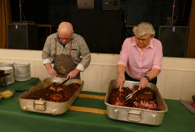 Foto 02: Für das fachmännische Zerschneiden des Spanferkels sorgten traditionell Beate Schulte und Winfried Linnenbäumer. Foto: Petra Glandorf